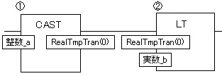 LT命令に割り付けた変数タイプが異なる場合、EXでは1つの命令に異なるタイプの変数を割り付けることができないため、変数タイプを合わせるための変数命令を追加してコンバートします。