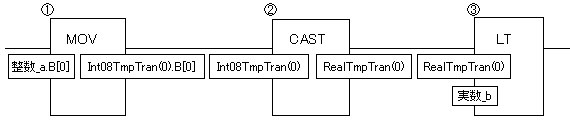 LT命令に割り付けた変数のビット長が異なる場合、EXでは1つの命令内に異なるビット長の変数を割り付けることができないため、ビット長を合わせるための変換命令を追加してコンバートします。