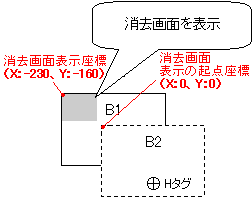 | 消去画面は「B2」の左上端を起点に表示されるため、マイナスの座標(X:-230、Y:-160)を指定していました。 |