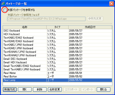 1. GP-Pro EX のメニュー [ 表示(V) ] から [ パッケージ一覧(P) ] を選択するか、 ![]() 2. [ パッケージの一覧 ] ウィンドウ ⇒ ![]() 3. [ 外部パッケージ参照先の変更 ] ウィンドウ ⇒ ![]() 4. [ フォルダの参照 ] ウィンドウ ⇒ ![]() 5. [ 外部パッケージ参照先の変更 ] ウィンドウ ⇒ ![]() 6. [ パッケージの一覧 ] ウィンドウ ⇒ ![]() 7. 以下のウィンドウが表示されますので、[ はい(Y) ] をクリックして次に進みます。 ![]() 8. [ パッケージの一覧 ] ウィンドウ ⇒ ![]() 9. [ パッケージの一覧 ] ウィンドウ ⇒ ![]() 1. GP-Pro EX のメニュー [ 表示(V) ] から [ パッケージ一覧(P) ] を選択するか、 ![]() 2. [ パッケージの一覧 ] ウィンドウ ⇒ ![]() 3. [ パッケージ ] ウィンドウに選択したパッケージの部品一覧が表示されます。 ![]()
