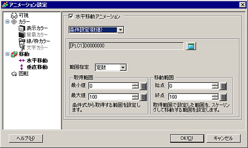 [水平移動アニメーション]にチェックを入れます。[条件設定(数値)]を選択してください。
