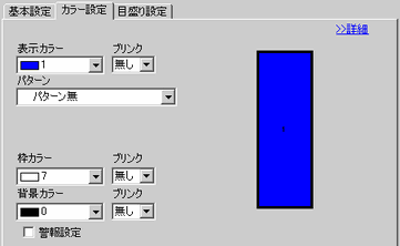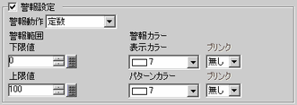点滅表示の有無および点滅の速さを指定します。警報表示時の[表示カラー]、[パターンカラー]それぞれにブリンクを設定できます。