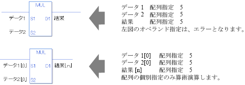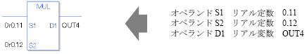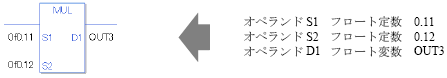 MUL、MULP命令は常に導通します。MUL、MULP命令を使用する場合は、S1、S2、D1オペランドに指定する変数の型が同じタイプでなければ、エラーとなります。S1、S2、D1オペランドはすべて同じ変数の型を指定してください。