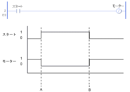 ポイントBビット変数(スタート)がOFFになると、OUTN命令のビット変数(モーター)がONになります。
