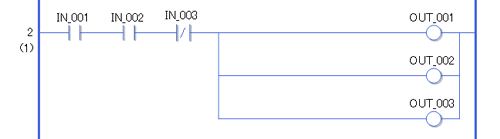 上記のプログラム例のように、OUTを複数分岐すれば使用可能です。OUT_001とOUT_002を直列で配置するとエラーとなります。