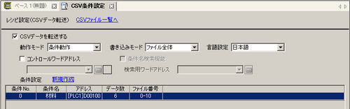 [共通設定(R)]メニューから[レシピ設定(R)]-[CSVデータ転送(条件設定)(T)]を選択するか、